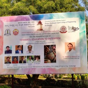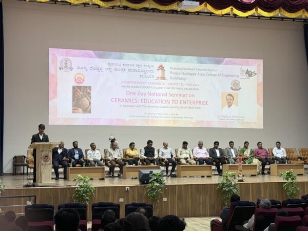 A one-day national seminar on “Ceramics: Education to Enterprise Opportunities” was organized by the Indian Ceramic Society Student Chapter of the Department of Ceramic and Cement Technology at PDA College of Engineering in Kalaburagi. The event was held in collaboration with the ACerS International Southwest India Chapter and the Indian Ceramic Society Karnataka Chapter.