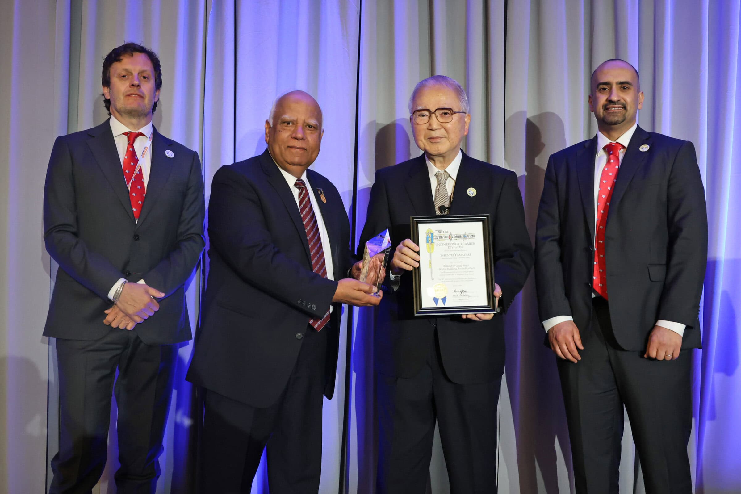 Yamazaki (center right) accepts the Bridge Building Award from the award’s namesake, ACerS Past President Mrityunjay Singh (center left). ICACC 2026 Program Chair Federico Smeacetto (left) and ECD Chair Amjad Almansour (right) stand alongside them. Yamazaki holds the Guinness World Record for “Most patents credited as inventor,” with the more than 20,000 patents focused primarily on semiconductor devices, thin-film transistors, and display technologies. Credit: ACerS