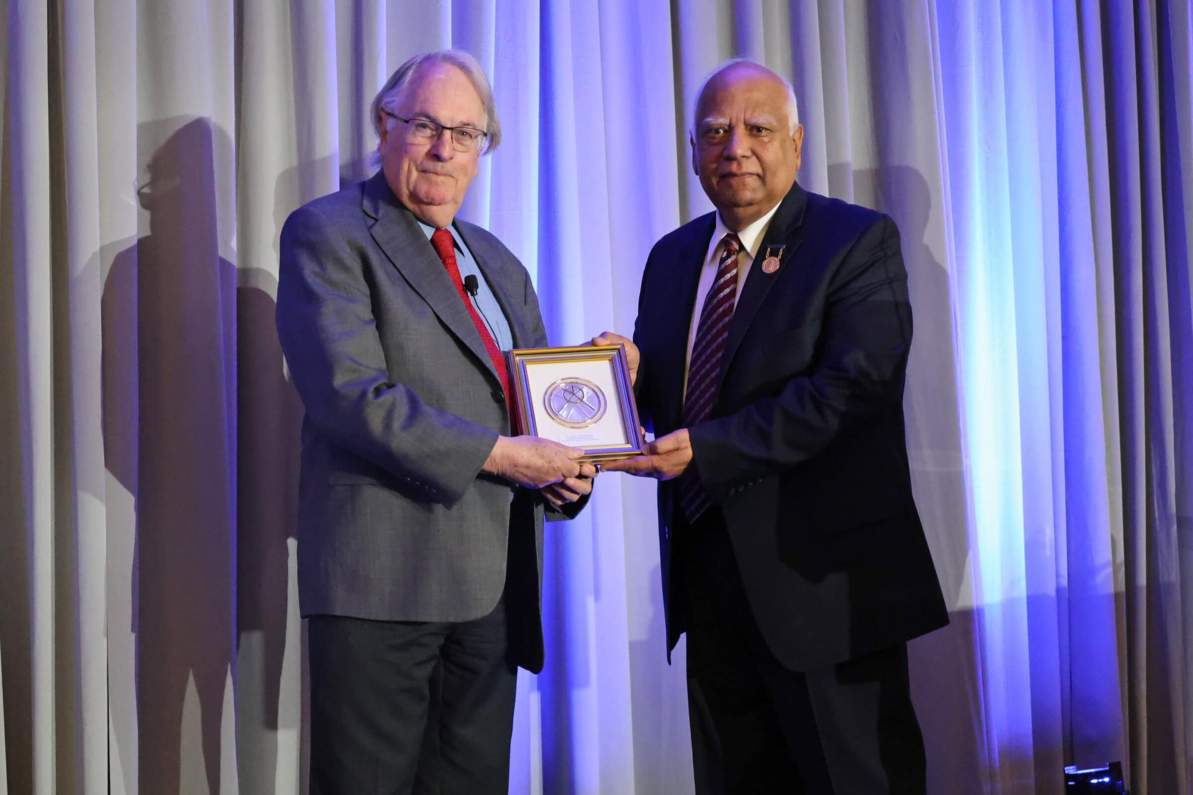 Following the Mueller Lecture, ACerS Past President Mrityunjay Singh (right) presented Whittingham with a diploma recognizing him as an Honorary Member of the World Academy of Ceramics. Credit: ACerS