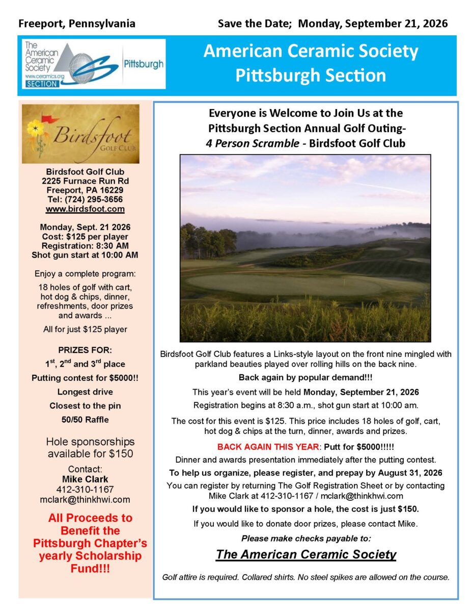 The Pittsburgh Section of The American Ceramic Society invites you to our Annual Golf Outing on Monday, September 21, 2026, at Birdsfoot Golf Club in Freeport, PA. This fun event supports the J. Earl Frazier Memorial Scholarship Fund.
