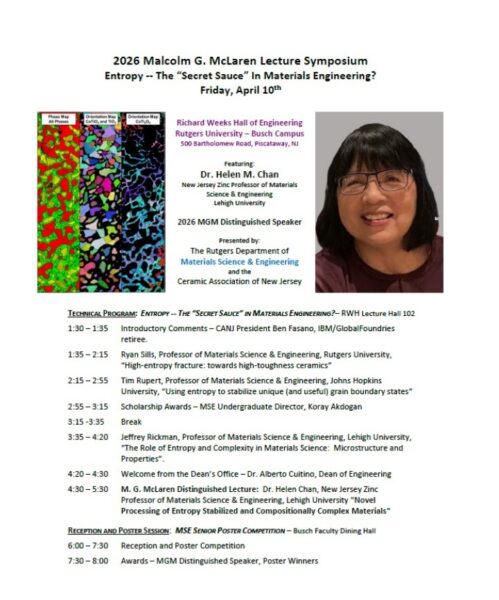 The ACerS New Jersey/New York Metro/Philadelphia Section, in conjunction with Rutgers University Department of Materials Science & Engineering, and the Ceramic Association of New Jersey, are hosting the 2026 Malcolm G. McLaren Lecture Symposium on Friday, April 10, 2026, at Rutgers University – Busch Campus (Piscataway).