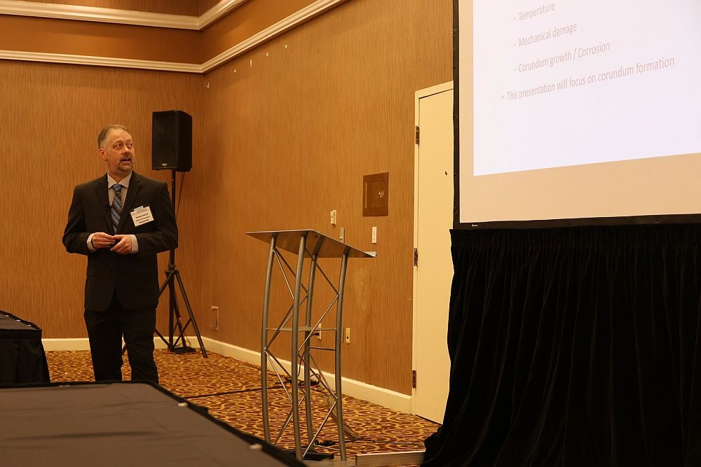 Roger Smith of Plibrico Company noted that boosting heat is a common technique to hasten aluminum production, but it can have the unattended effect of exacerbating corundum formation as well. Credit: ACerS