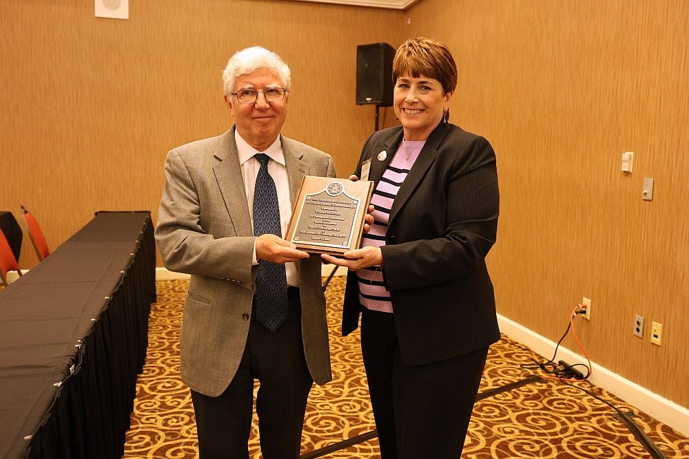 ACerS Fellow Nancy E. Bunt of Imerys, right, presents Tomas Richter with the 2026 Theodore J. Planje Refractories Award. Credit: ACerS
