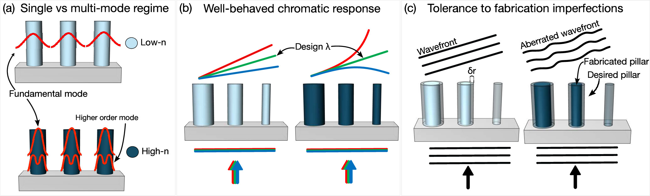 The researchers created several types of metasurfaces out of silica and titanium dioxide, including metagratings, metalenses, and vortex phase plates. In each case, the lack of multimode light propagation among the silica nanopillars meant the desired optical performance could be achieved even with a significantly higher number of fabrication errors, in contrast to the titanium dioxide-based metasurfaces.