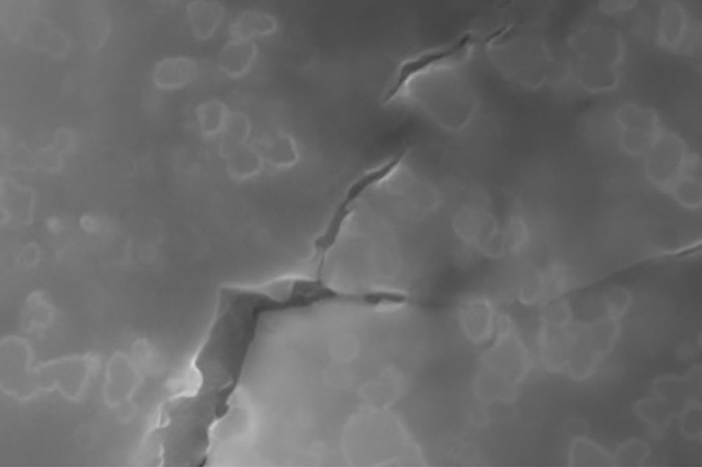 [Image above] An electron micrograph of a new, tougher glass developed at the University of California, Los Angeles, showing how nanoparticles (rounded, irregular shapes) deflect a crack and force it to branch out. Credit: SciFacturing Lab, UCLA