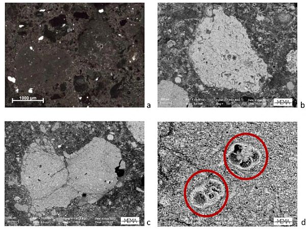 Thin section microphotographs of two thermally altered limestone fragments in sample SA3: (a) Polarizing microscope; (b, c) Backscattered electron images at high magnification; (d) Backscattered electron image showing a particular section of limestone with visible micro-fossiliferous content. Credit: Amicone et al., Scientific Reports (CC BY 4.0)
