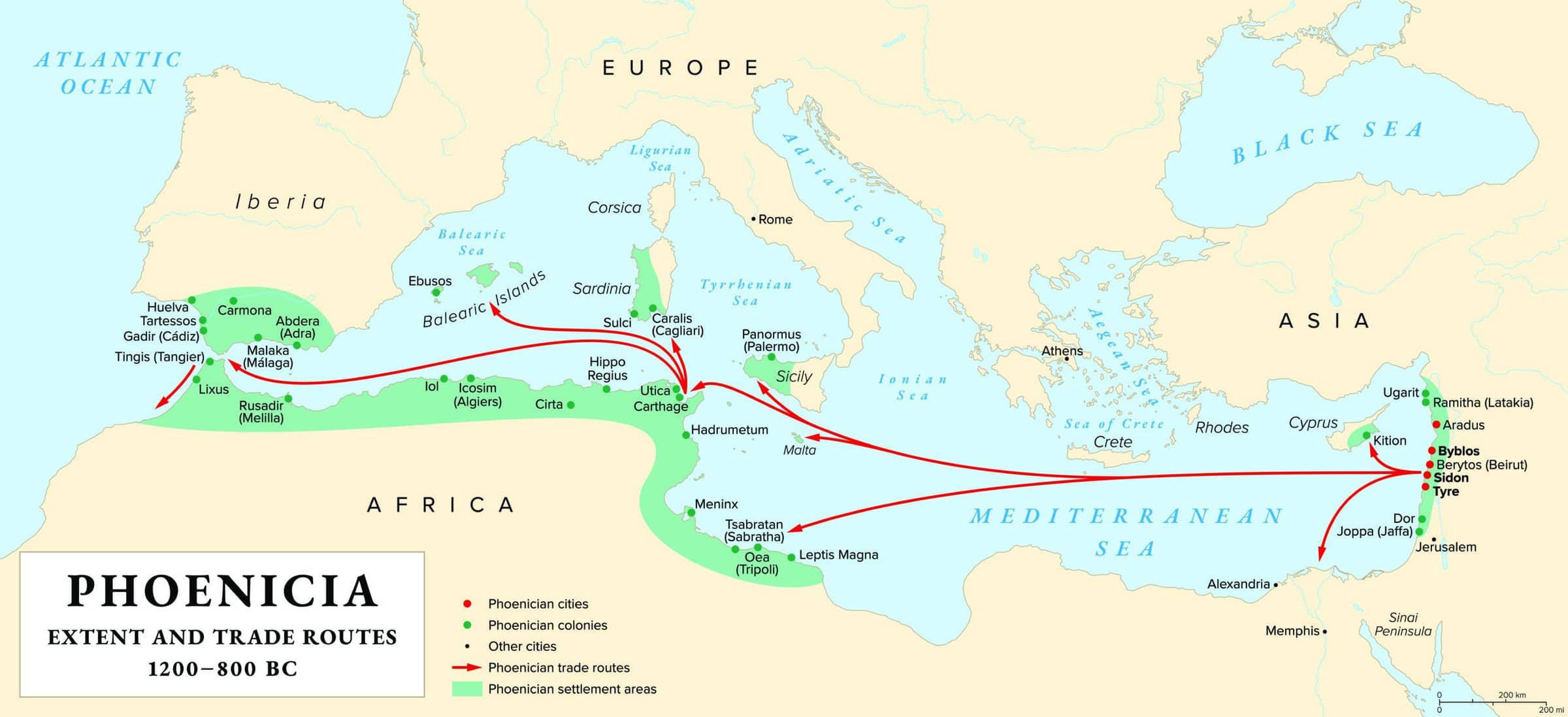 Approximate extent of Phoenician settlements and trade routes till 800 BCE. Credit: Peter Hermes Furian / Shutterstock