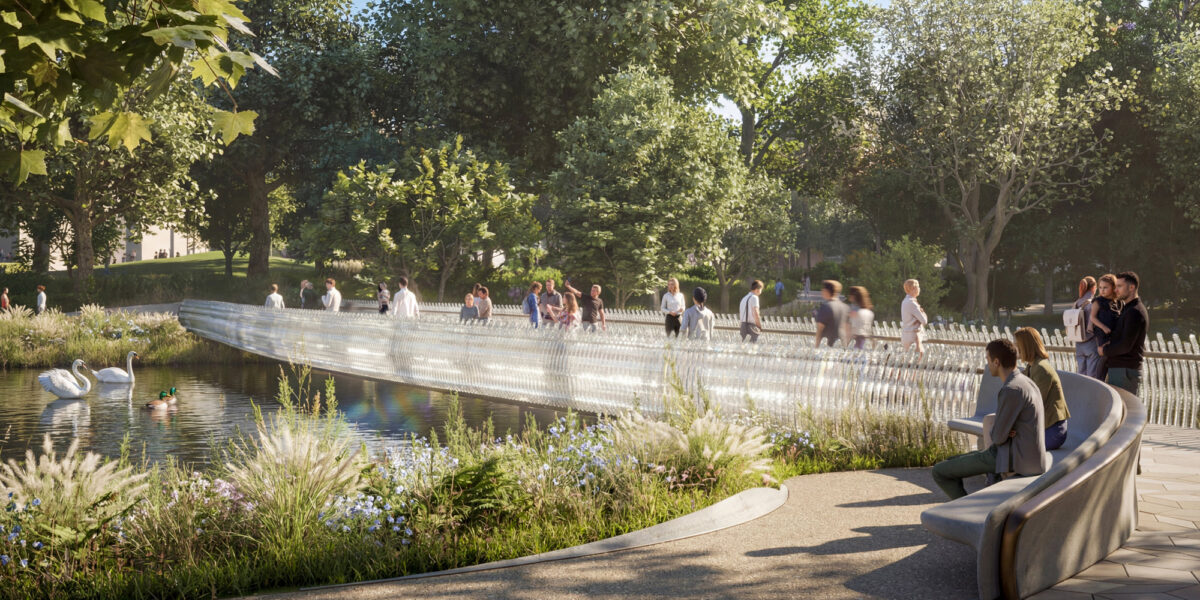In June 2025, British international architecture firm Foster + Partners was announced as the winner. The centerpiece of their masterplan design, which will transform a portion of St. James’s Park (located across from Buckingham Palace), will be a cast-glass bridge inspired by the historic Queen Mary’s Fringe Tiara.