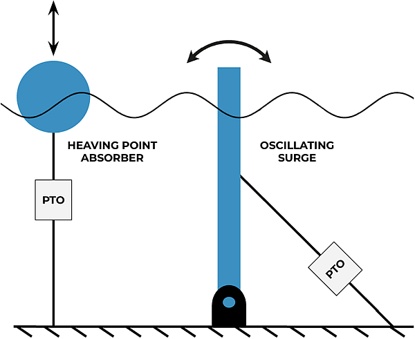 The heaving point absorber (left) bobs up and down with waves while the oscillating surge wave energy converter (right) rotates laterally with the waves. Both prototypes are moored to the floor with a power take-off (PTO) attached to convert wave motion into rotational motion needed for electricity generation. Credit: Vitale et al., Journal of Mechanical Design (CC BY 4.0)