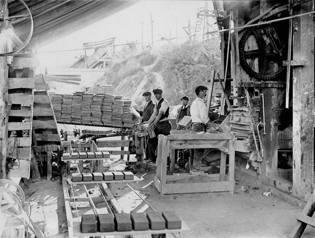 Workers using the Ver Valen automatic brickmaking machine at the Excelsior Brickyard in Haverstraw, N. Y., circa 1900. From the Dan DeNoyelles Collection of the Haverstraw Brick Museum Archives. © Haverstraw Brick Museum. Republished with permission.