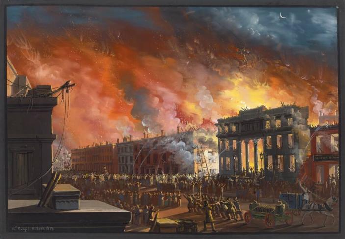 The Great New York Fire of 1835 broke out on December 16 and raged for more than 15 hours on the coldest day in 36 years (17 degrees below zero). The fire is depicted in this gouache (opaque watercolor) painting by Italian–American painter Nicolino Calyo. Credit: The Bayou Bend Collection of The Museum of Fine Arts, Houston (Public domain)