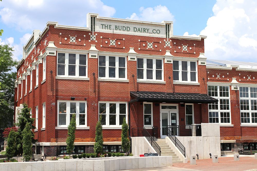 Budd Dairy Food Hall in Columbus, Ohio, is situated in the historic Budd Dairy Company building, a former milk processing and distribution facility. The space was renovated beginning in 2018 and opened to the public in April 2021. Credit: Eric Glenn / Shutterstock